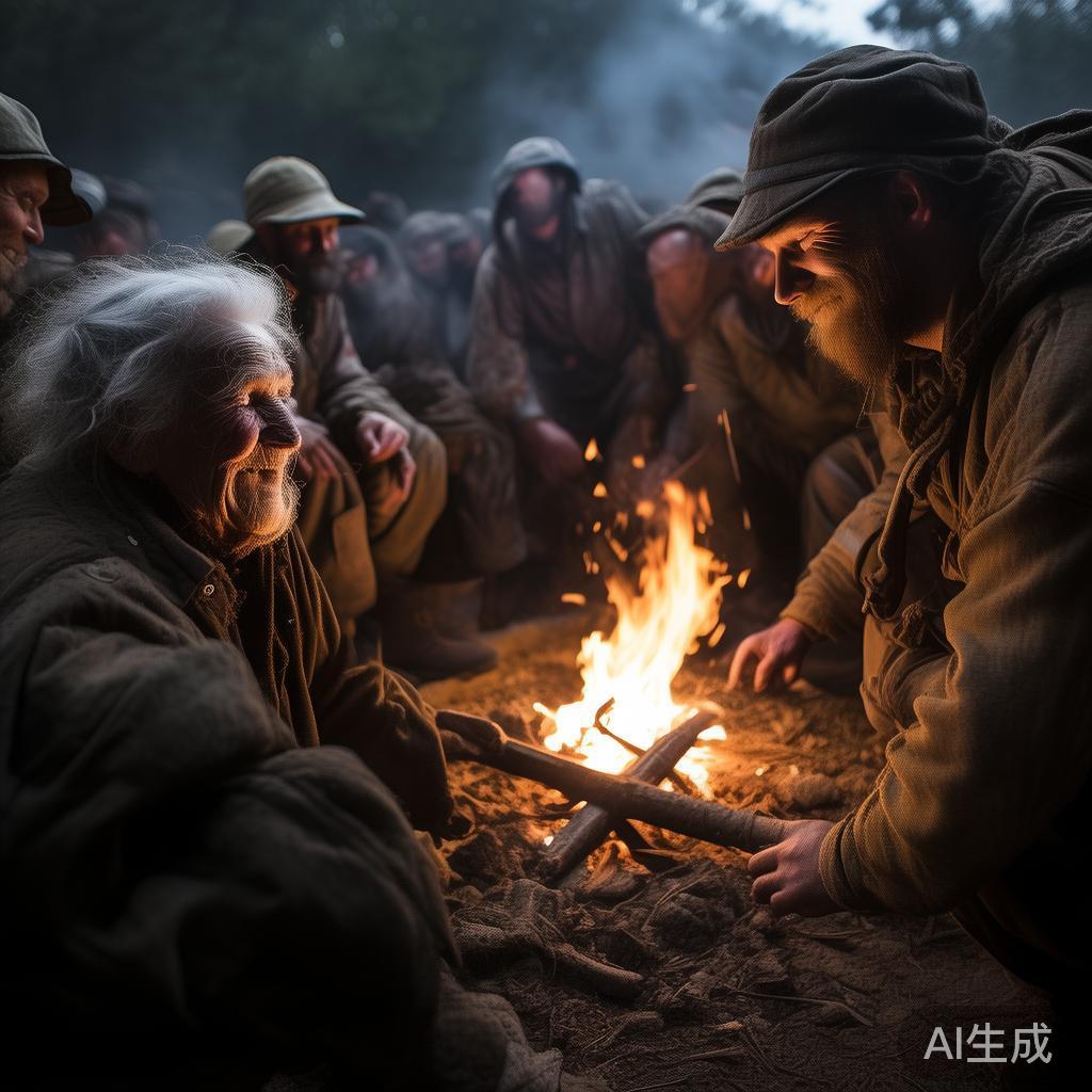 几名士兵正在火堆附近取暖,其中一位叫他过去,十分热情地揽住他,让他烤烤火,给他找个安身之所。老妪乖巧地徘徊过来,请求士兵帮他卸下酒桶,并且跟他们闲聊,稍微试探性地询问。“老妈妈,您的酒桶里装的什么呀,这么重?”他就趁机卖起了酒,吸引士兵们的注意力。