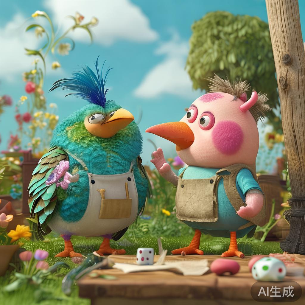 不过吧,你知道吗?有时候日子太顺利,人就容易变得懒惰,开始想些奇怪的主意。有一天,小鸟在外面碰到了另一只鸟朋友,自豪地分享它的幸福生活。然而,那只鸟却嘲笑小鸟,觉得它傻,把自己辛苦勤快的样子和家里的简单安逸对比着说:你看看待在家的伙伴是多轻松啊,生火、担水之后,然后就是享受午睡。而香肠呢,只在锅边坐着,等吃饭时加点调料,活儿做得轻松得很。